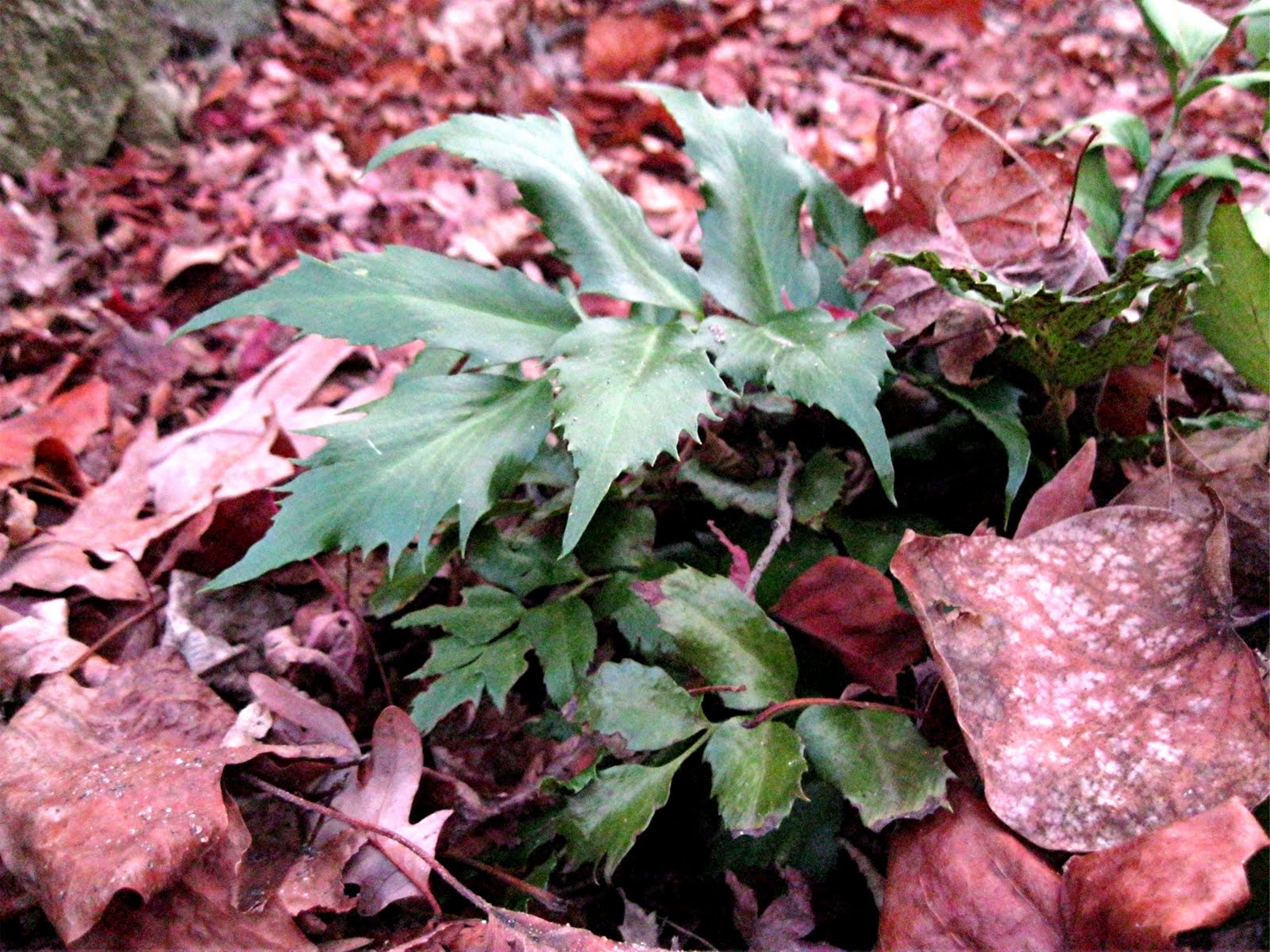 It keeps them cosy, moderating the rise and fall of temperatures in the top few inches of the soil. Temperatures fell into the low 20's F last night but these guys look great. From the top they're Arachniodes standishii, Cyrtimium falcatum, Coniogramme emeiensis, and Polystichum polyblepharum.Other evergreen perennials appreciate this kind of airy leaf mulch; Hellebores, Epimediums, Asarums among others. Leaves constantly moving in the wind are trapped under the plants. During my weekly "touch-ups" I will remove excess leaves that may mound or mat against he plants. That's more an aesthetic issue; still important though.